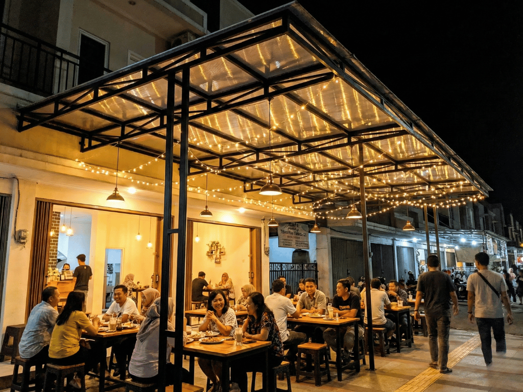 Saat malam hari tiba, struktur kanopi ini bisa Anda manfaatkan untuk menata pencahayaan lampu hias. Anda bisa menggantungkan lampu-lampu warm white atau lampu string (lampu tumblr) tepat di bawah rangka atap. Pantulan cahaya lampu pada permukaan bagian dalam polycarbonate akan menciptakan suasana yang romantis dan hangat. Hal ini tentu saja membuat pelanggan betah berlama-lama, yang ujung-ujungnya bisa meningkatkan peluang mereka untuk menambah pesanan. Desain pencahayaan yang terintegrasi dengan baik pada struktur kanopi akan membuat cafe Anda terlihat menonjol dan menarik perhatian orang yang lewat di depan tempat usaha Anda.
