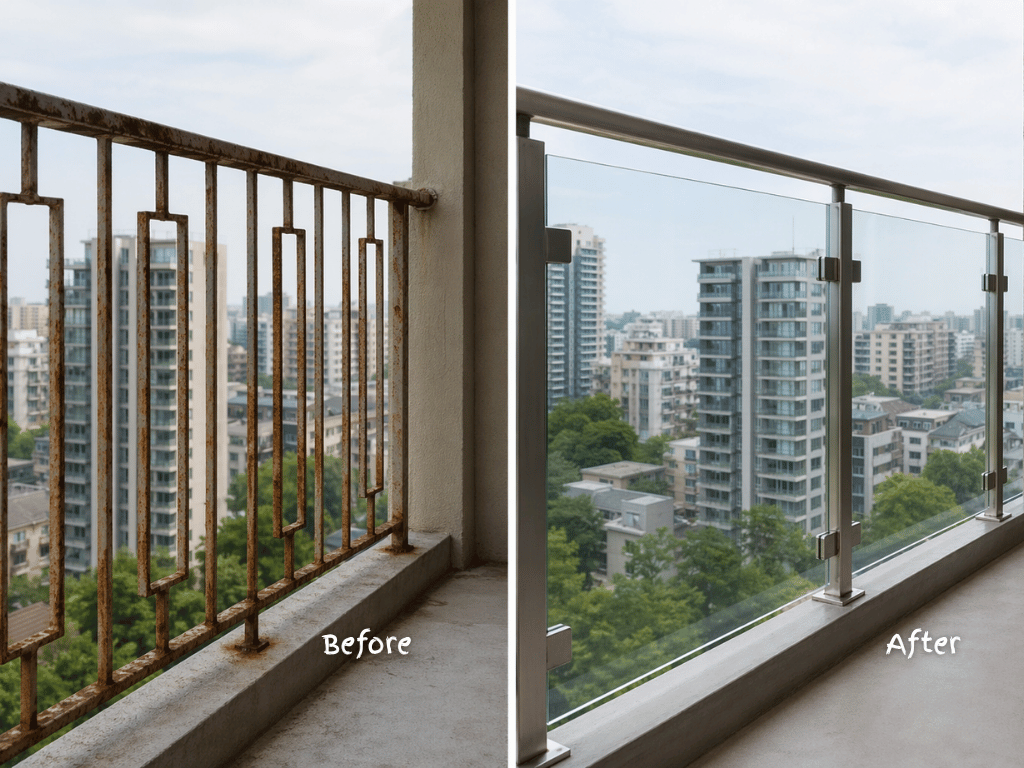 Kaca ataukaca tempered adalah pilihan yang terasa lebih “premium” dan memang memberi kesan bersih dan terbuka. Tapi kaca bukan tanpa risiko. Retakan akibat benturan bisa terjadi, dan meskipun kaca tempered tidak langsung hancur saat retak, proses penggantiannya tidak mudah dan cukup mahal. Bobotnya yang berat juga memberi beban tambahan pada struktur balkon dan membutuhkan penopang yang lebih kuat.